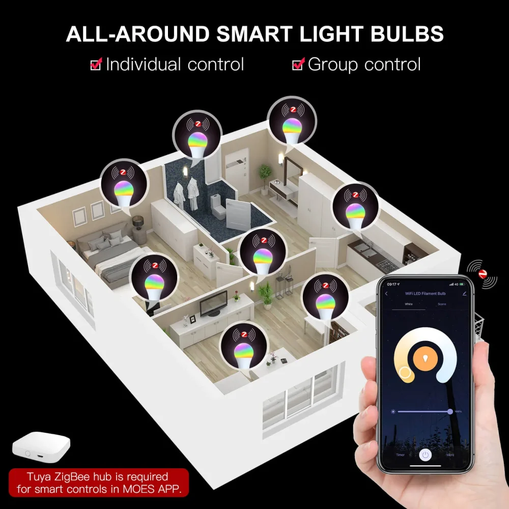 MOES ZigBee Smart Bulb to doskonały punkt wyjścia do inteligentnego oświetlenia w domu — lub doskonały dodatek do istniejącego systemu. Połącz przystępność z potężnymi funkcjami, efektywność energetyczną z wartością rozrywkową oraz prostą konfigurację z profesjonalną kontrolą. Przekształć oświetlenie swojego domu już dziś.
